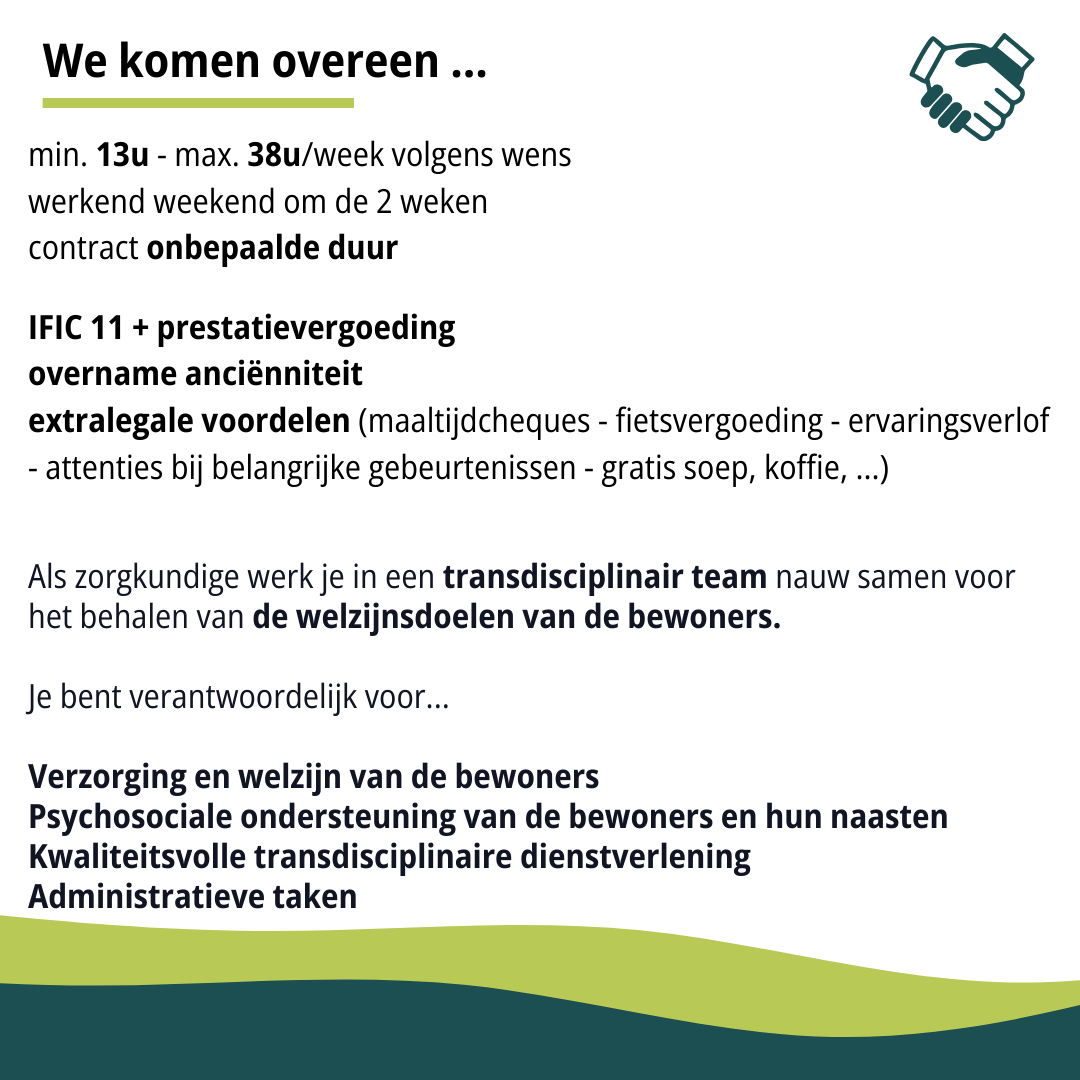 Als zorgkundige werk je in een transdisciplinair team nauw samen voor het behalen van de welzijnsdoelen van de bewoners.
